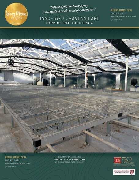 Total area on ±2.5 acres (covered + uncovered). Includes approx. ±73,200 SF greenhouse + ±1,800 SF warehouse/support building + yard area. ±37,200 SF GH1 ±36,000 SF GH2 • ±73,200 SF greenhouse structures • ±1,800 SF warehouse / support building • Extensive covered & uncovered yard space • Flexible configuration: 1,800–73,200 SF • Prime Carpinteria ag-industrial location Ideal for greenhouse operator, nursery, ag yard, light ag-industrial user. Contact Kerry Mann, CCIM for full equipment list. kerrymannwcre@gmail.com 805.452.0654