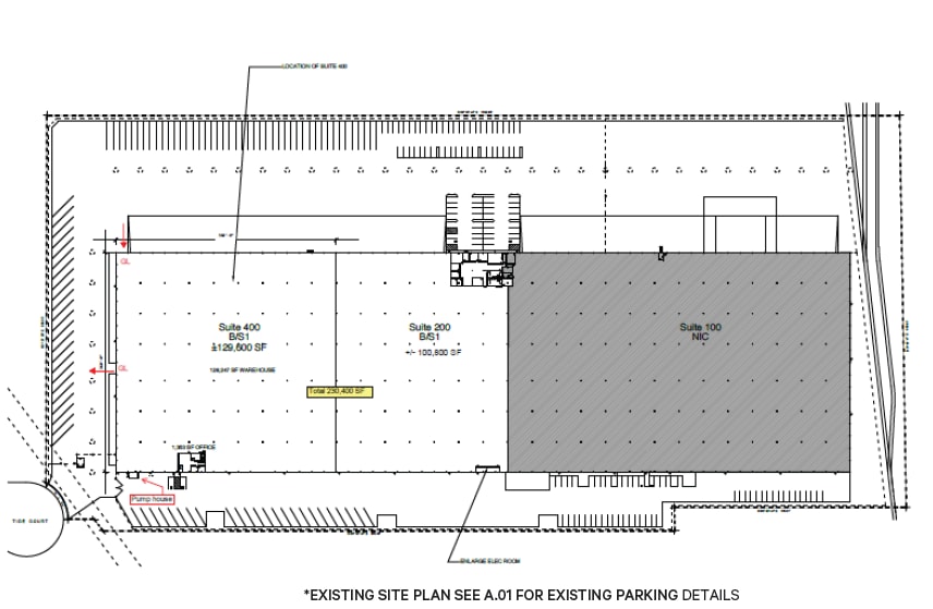 +Existing Office Space: ±6,307 SF +40’x50’ Column Spacing +(25) Docks & (1) GL Door +2,000 amp 277/480 Volt Electrical Service +T-5 Motion Sensors +±24’-±29’ Clear Height +Excellent Trailer Storage +Skylights +70-foot Concrete Dock Apron +Exterior LED Lighting Around Entire Site +Fenced & Secured Site +Metal Roof with R-19 Insulation Suite 400: + Office Space: ±1,353 SF + 16 Dock High Doors (Equipped with Pit Levelers with 30,000lb Capacity) + 1 GL Door + Sprinklered (can be upgraded to ESFR)