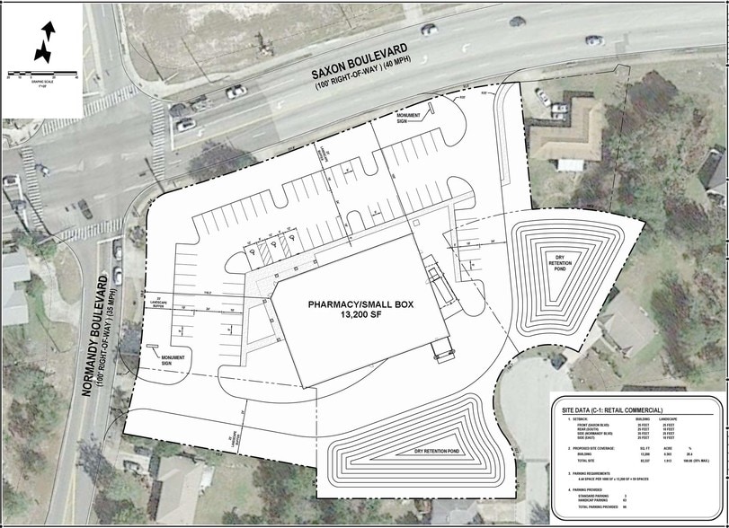 2.51+/- Acre High-Exposure Corner Site for Ground Lease. This proposed retail site is located at a busy, signalized intersection directly across from Walgreens and offers approximately 480+/- feet of frontage. The property is surrounded by dense, established residential neighborhoods and benefits from excellent exposure and visibility. The site presents an outstanding opportunity for freestanding fast food, retail, convenience store, or bank development and may be subdivided. Conceptual Parcels: Drive-Thru QSR Pad: 1.26+/- acres (2,500 SF prototype) Bank or Retail Pad: 1.25+/- acres (4,000 SF prototype) LOCATION DESCRIPTION Located at the southeast corner of Normandy Boulevard and Saxon Boulevard. Approximately 0.7 miles to Interstate 4 and 2 blocks to Publix Shopping Center.