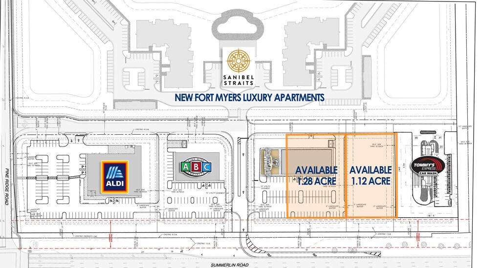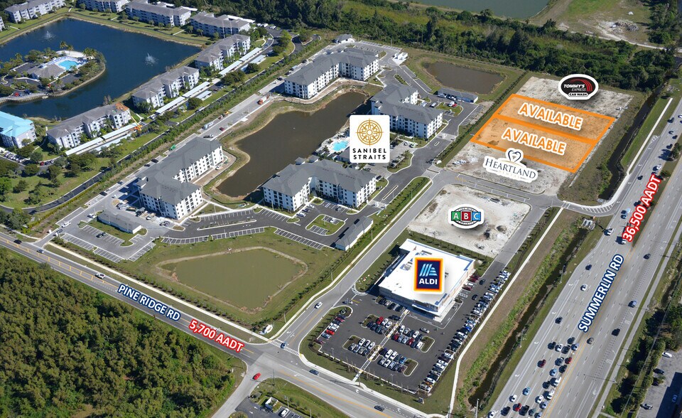 Summerlin Ridge Commons is a new mixed use project, anchored by Aldi Grocery Store and features ABC Liquor, Heartland Dental and Tommy Wash. Sanibel Straits is a 224 until luxury apartment community that was finished in 2020 and is fully leased. Remaining outparcels available for sale from 1 to 2.4 acres. Infrastructure has been installed, including interior roads, lighting, shared retention and utilities stubbed to the pads. Right in access from Summerlin with access back to Pine Ridge Rd through the rear of the property to a fully signalized traffic signal. Summerlin Rd is the main corridor to Fort Myers Beach and Sanibel and Captiva Islands.