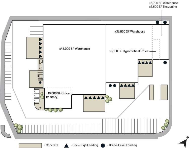 Industrial facility divisible to 35,000 SF, featuring a two-story office component, strong power capacity, secure site access, efficient dock and grade loading, and ample auto and trailer parking.