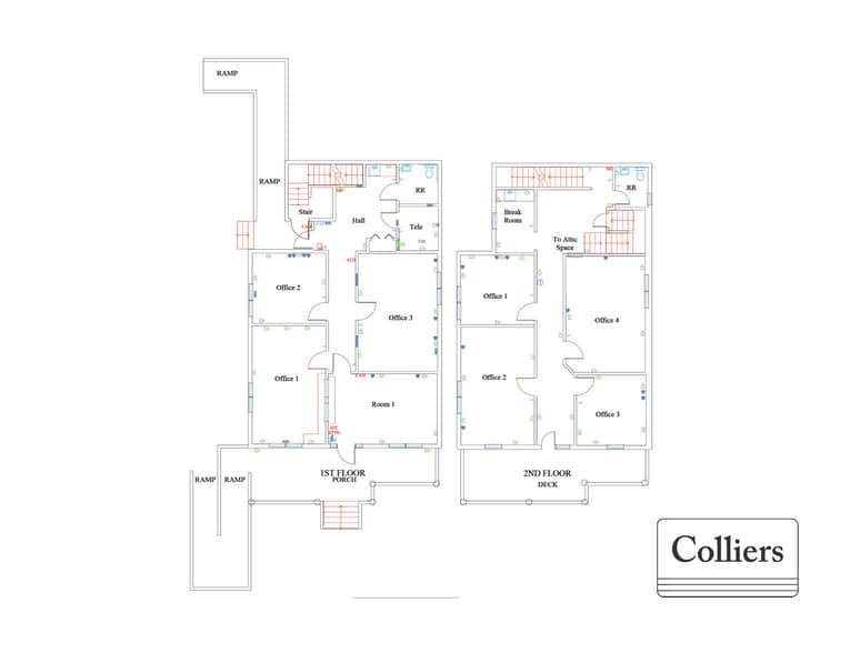 - Efficient 7 office layout with restrooms on both floors, break room and reception area