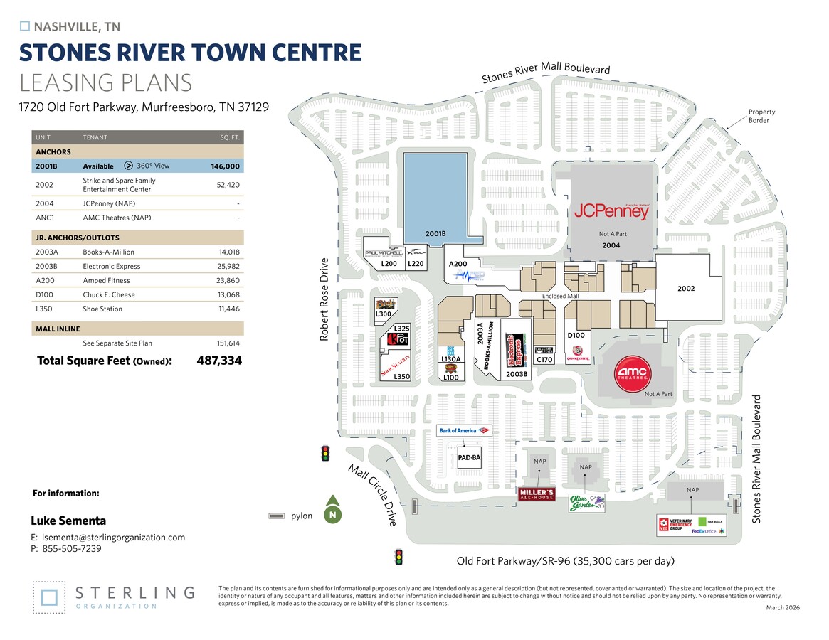 Stones River Town Centre is an enclosed mall with an open-air lifestyle component located in Murfreesboro, TN, a flourishing suburb of Nashville. The property is anchored by Sears, JCPenney and AMC Theatres. A diverse mix of junior anchors and national retailers include Books-A-Million, Finish Line, Shoe Carnival, Electronic Expressm Rockbox Fitness, XGolf and Chuck E. Cheese's. The property is located in Murfreesboro's primary retail node and the center benefits from its proximity to Middle Tennessee State University.