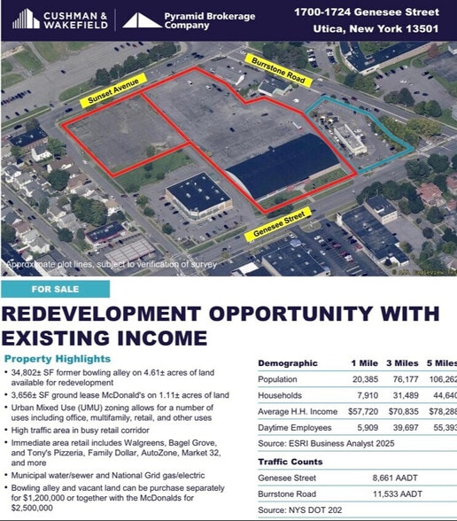 McDonald's ground lease at 1700 Genesee Street (3,656+/- SF), 1724 Genesee Street, former/vacant bowling alley (34,802+/- SF on 3.3 acres) and an additional 1.31 acres of vacant land on the corner of Sunset and Shepard Place. McDonald's lease commencement was in 1999 and they are currently in their 2nd of 4 five (5) year renewal options. Bowling alley and vacant land are well positioned for redevelopment. Please contact the listing brokers with questions.