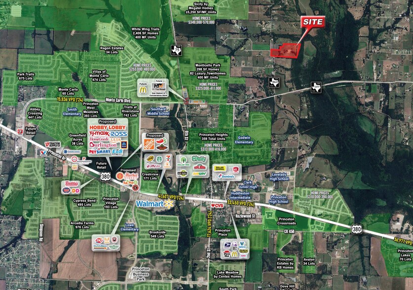 Several new developments planned or in construction within the immediate area include Princeton Heights, Monticello Park, Sicily, Whitewing Trails, Southridge, and Serenity