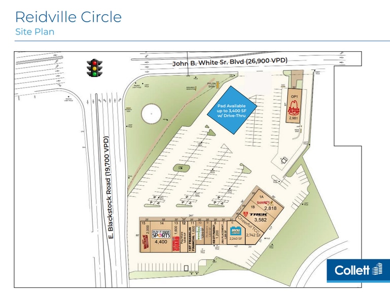 Reidville Circle offers a prime outparcel opportunity for ground lease in one of Spartanburg’s most active retail corridors. Positioned at the intersection of John B. White Sr. Boulevard and E. Blackstock Road, the site benefits from exceptional visibility and traffic counts of 26,900 VPD and 19,700 VPD respectively, with direct access to I-26 (47,800 VPD) via Exit 22. This strategic location places the property within a thriving commercial hub anchored by national retailers and restaurants, including Target, Walmart, Sam’s Club, Lowe’s, and Best Buy, as well as numerous dining options such as Outback Steakhouse, Five Guys, and Zaxby’s. The available pad can accommodate up to 3,400 SF and includes the option for a drive-thru, making it ideal for quick-service restaurants, financial institutions, or other high-traffic retail concepts. The property is co-tenanted by strong regional and national brands such as Play It Again Sports, Shane’s Rib Shack, Wayback Burgers, and Trek Bicycle Sports, ensuring consistent customer draw. Surrounding residential neighborhoods on Spartanburg’s West Side provide a strong demographic base, with an average household income exceeding $84,000 within a 3-mile radius and a projected population growth trend. This location combines high visibility, strong co-tenancy, and excellent access to major transportation routes, making it a premier choice for retailers seeking a high-performing site in the Spartanburg market.
