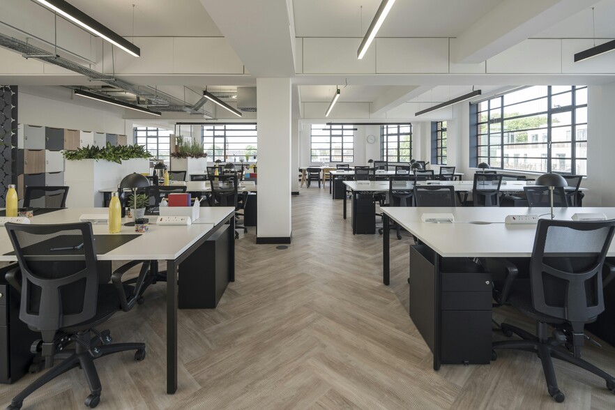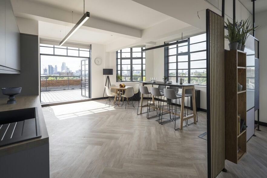The property is a former 1930’s factory, which has since been converted into high quality office accommodation. Upon entering the building, one is greeted with an impressive reception providing a hat tip to its former industrial heritage with an exposed cast iron column, large warehouse-style entrance door and themes of exposed concrete throughout the communal areas. The available office accommodation is location on 4th floor and has been refurbished to provide a fully fitted office floor with two demised roof terraces. Original factory style windows spanning three elevations along with a generous floor to ceiling height provide an abundance of natural daylight and volume throughout.