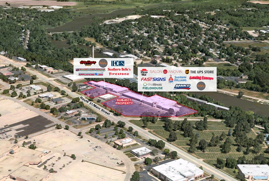 High profile location on Rte 31, just north of Rte 72, and minutes from I-90 4,000 SF - Can be easily subdivided into 1,600 and 2,400 SF units: - 2,400 SF Unit - one bathroom, open retail area, rear storage and drop ceiling - 1,600 SF Unit - two bathrooms, open retail area, rear storage and drop ceiling - Entire unit measures 50’ wide x 80’ deep. Currently operating as Sewing Concepts - Join Firestone, UPS Store, Southern Belle’s Pancake House, Pizza Hut, Sherwin Williams, Salon Anovin, MAACO, Athletico, Flaming Hot Deals, OrthoIllinois Fieldhouse, Appliances 4 Less, Fast Signs, Artistry Dance & Co. - Adjacent to Aldi, Auto Zone & FIfth Third Bank, and across the street from Panera & Olive Garden - Two signalized intersections with multiple access points - Strong median annual household income of $109,000