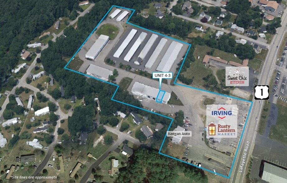 1,654± SF multi-level warehouse/office space available for lease in an industrial park off Route 1/Lafayette Road, North Hampton, NH. Unit 4-3 consists of warehouse space, first and second floor office space, and one 1/2 bath. The park includes 3 industrial buildings, self-storage units, Irving, Rusty Lantern Market, and Keegan Auto.