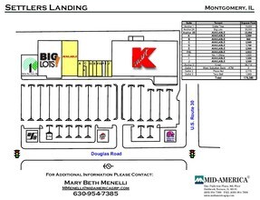 Now leasing at Settlers Landing, a prominent 181,000+ SF community retail center located at the busy intersection of Douglas Road and US Highway 30 in Montgomery, IL. This high-visibility shopping center offers excellent signage opportunities, over 835 parking spaces, and strong daily foot traffic driven by national anchors including U-Haul, Planet Fitness, and Dollar Tree. Multiple suites available, including up to ±6,353 SF of contiguous space, ideal for a wide range of retail or service businesses. Ideal For: Quick-service or sit-down restaurants Medical, dental, or wellness clinics Fitness or personal training studios Specialty grocery or convenience stores Retail boutiques or franchise concepts Education/tutoring centers or professional services Take advantage of this high-traffic location in a growing commercial corridor with great access and strong co-tenancy. Available for immediate occupancy!