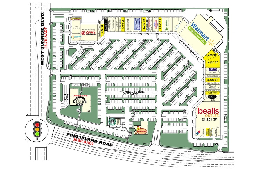 Retail space for lease in Jacaranda Square located in Plantation, FL at the NW corner of Pine Island Rd. and Sunrise Blvd. in Broward County. Anchored by Walmart Neighborhood Market, this grocery-anchored center provides repeat daily visitors and boasts an average traffic count of 75K+ cars daily. National tenants include Walmart Neighborhood Market, Bealls Outlet, Davita, Starbucks, La Granja, and Quest Diagnostics with Chow's Country Buffet & Powerhouse Gym Coming Soon. Jacaranda Square is centralized just 4 miles from I-595, I-95, I-75, the Florida Turnpike and close to Amerant Bank Arena and Sawgrass Mills Mall in Sunrise.