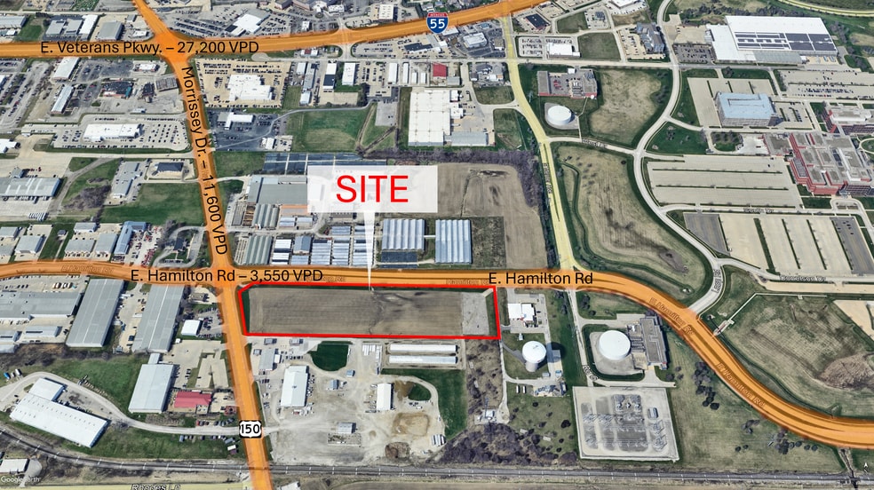 The parcel is on the southeast corner of Hamilton Rd, & Morrissey Dr./US150 in southeast Bloomington and features roughly 300’ of frontage on Morrissey Dr. & 1200’ of frontage on Hamilton Rd.