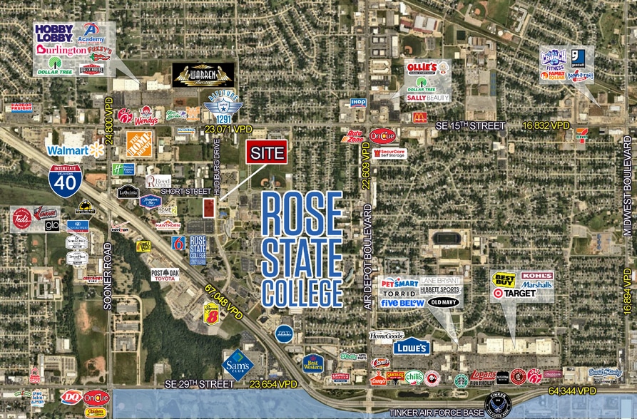 Strategically located just off Interstate 40, the property provides excellent accessibility and visibility within a well-established hospitality corridor. The site is within walking distance to Rose State College, a 120-acre campus with over 8,000 students, and the Midwest City Reed Conference Center, which features 21,000 square feet of meeting space accommodating over 1,000 attendees. The surrounding area includes a robust mix of retail, dining, and lodging options, with national brands such as Walmart, Home Depot, and numerous restaurants nearby. Tinker Air Force Base, the state’s largest employer and a major Maintenance, Repair, and Overhaul (MRO) facility, is located less than a mile away, driving strong demand for hospitality and related services. All utilities are in place, and the site is priced at $1,025,000 ($14.70 per square foot), offering a compelling opportunity for hotel development, restaurants, or potential housing. With its prime location, infrastructure readiness, and proximity to major traffic generators, this property represents a valuable investment in a growing market.