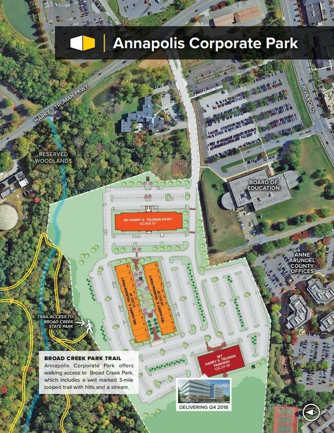 In 2016, this building was awarded LEED certification at the Gold level by the U.S. Green Building Council. Annapolis Corporate Park is a 28-acre project with four planned buildings, comprising approximately 250,000 square feet of LEED certified Class “A” office space with a campus-like business environment. Offices are designed to your requirements and feature 24-hour access. It is located directly off Harry S. Truman Parkway near the intersection of Riva Road, immediately south of MD Route 50. The park is immediately adjacent to Anne Arundel County government offices, and is within a short walk of numerous amenities, such as Subway, Dunkin’ Donuts, Jake’s Wayback Burgers, Crab Cake Cafe, CVS, BB&T Bank, and more. Located across Riva Road from Annapolis Technology Park, Annapolis Corporate Park is just five miles from downtown Annapolis, with quick connections to Baltimore, Columbia, and DC markets, as well as BWI Airport.