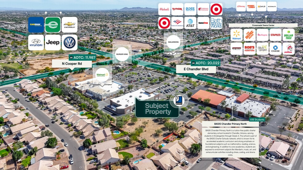 The asset is strategically positioned within Cooper Park Marketplace and benefits from shadow-anchor synergy with a high-performing Walmart Neighborhood Market. The surrounding retail ecosystem is further reinforced by national neighbors including Walgreens, Burger King, and BASIS Chandler, a nationally recognized charter school that attracts high-income households to the immediate area. Built in 2021 as a build-to-suit facility, the property features a modern 21,054 SF tilt-up concrete building situated on an expansive 2.27-acre parcel, purpose-designed to support durable, recession-resilient cash flow as a combined retail and donation hub.
