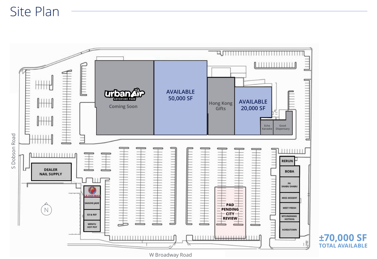 The property offers a rare 20,000 +/- SF and 44,615 +/- SF anchor opportunity at the high-traffic intersection of Broadway Rd. and Dobson Rd. in central Mesa. The center features excellent visibility, strong demographics, and easy access to Loop 101, US-60, and Loop 202. The center is undergoing a full facade renovation project. Positioned within an established trade area, the property benefits from over 102,000 vehicles per day, proximity to Valley Metro Light Rail, and significant nearby multifamily development. Urban Air Adventure Park is opening soon, further enhancing traffic and tenant synergy. Ideal for large-format retail, entertainment, fitness, or specialty grocers seeking a high-density, high-visibility Mesa location.