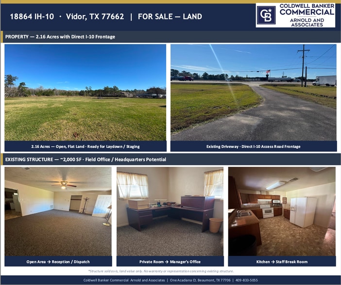 Approximately 2.16 Acres * located with direct access to IH10 feeder road (north side) Future use must be used for commercial application Property being sold as "land value only" with no warranty or representation concerning the existing structure
