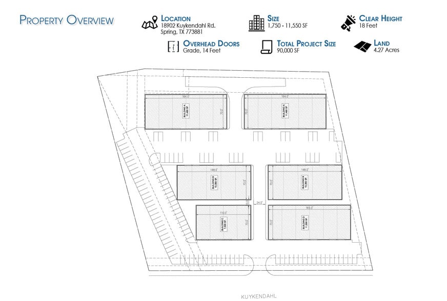 Modern design with 10% office build out 1,750 - 11,550 SF available Clear Height: 18 feet Overhead Doors: Grade, 14 feet Insulated warehouses Total Project Size: 90,000 SF Land: 4.27 Acres