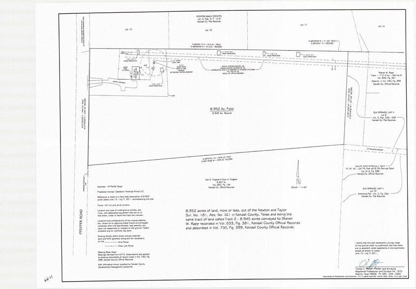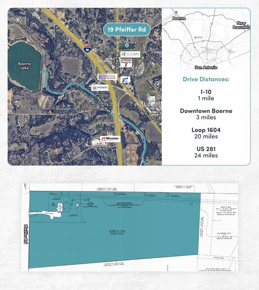 The property consists of 8.952 acres of land located at 19 Pfeiffer Rd in Boerne, Texas. It is situated approximately one mile from Interstate 10 and three miles from Downtown Boerne. Loop 1604 is about 20 miles away, and US 281 is approximately 24 miles from the site. The land is cleared and features flat topography. Utilities available include power, well, and septic. The property is zoned OCL (Unrestricted).