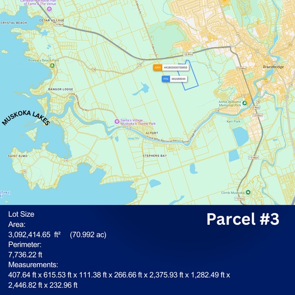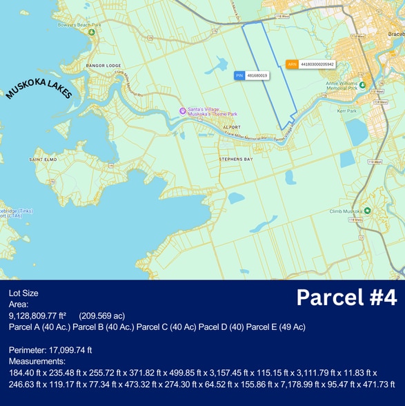 This prime 280 acre parcel is situated on the west side of Bracebridge, Ontario in the Muskoka district. This development Site consists of 2 Land Parcels (140.3Acres + 41.2 Acres). Proposed Density is 7349 units at $13,607 per unit.