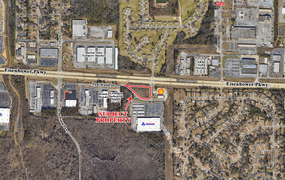 Conveniently located on Eisenhower Parkway (US Highway 80) between I-75 and I-475. Nearby businesses include Devon Self Storage, ARK Self Storage, Walsh Honda, Grainger Industrial Supply, Academy Sports, Macon State Farmers Market, Lowe’s, Central Georgia Technical College, Havertys, Applebee’s, Harbor Freight, Builders First Source, and many other retailers and restaurants.