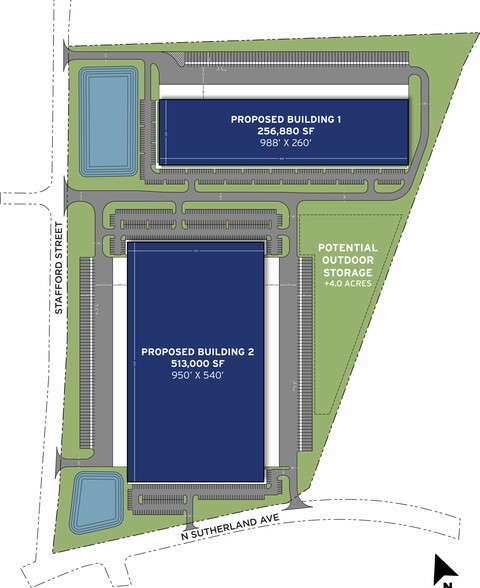 - Building 1 offers 256,880 SF with 32-foot clear height; Building 2 offers 513,000 SF with 36-foot clear height.