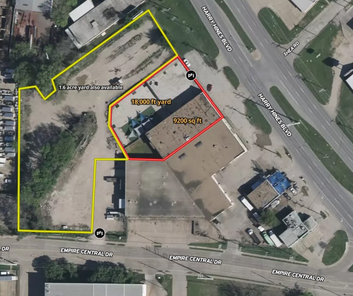 Warehouses with fenced storage yards, outside storage, ample loading docks and grade-level doors, auto repair permitted, located at the corner of Harry Hines and Empire Central, high traffic and high visibility.