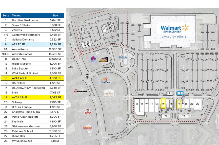 Located at the southeast corner of Galleria Boulevard and Sardis Rd N Nearby retailers include Walmart, Dollar Tree, Aarons, GameStop, T-Mobile, Hibbett Sports & more