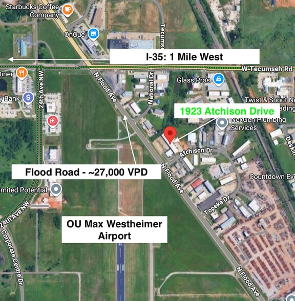 $1,655.73/month for an individual suite. 1917 Atchison Drive offers flex industrial space on Flood Road with excellent access Max Westheimer Airport, I-35, OnCue, Starbucks, and the University of Oklahoma. The property is well-suited for office, professional services, light industrial, or owner-operator use, with efficient layouts and on-site parking. Owner-managed and ready for immediate occupancy, this space provides a practical, cost-effective alternative to newer Class A product while maintaining strong visibility and accessibility. *Recent renovation *Huge traffic counts and visibility from Flood Road *Across street from North part of Max Westheimer Airport *Flexible office / flex configurations *Immediate availability *Ample on-site parking *Easy access to I-35, Main Street, and OU *Owner-managed = faster decisions *Strong local workforce draw *Functional layouts with natural light *Competitive lease rates for Norman market