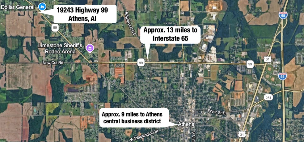 This 1.1 +/- acre opportunity on Alabama Highway 99, just 1/4 mile from Dollar General is a great opportunity for continued residential use, a location for your growing business, or an investment for future commercial development. Approximately 9 miles from the center of the City of Athens, and approximately 13 miles to Interstate 65.
