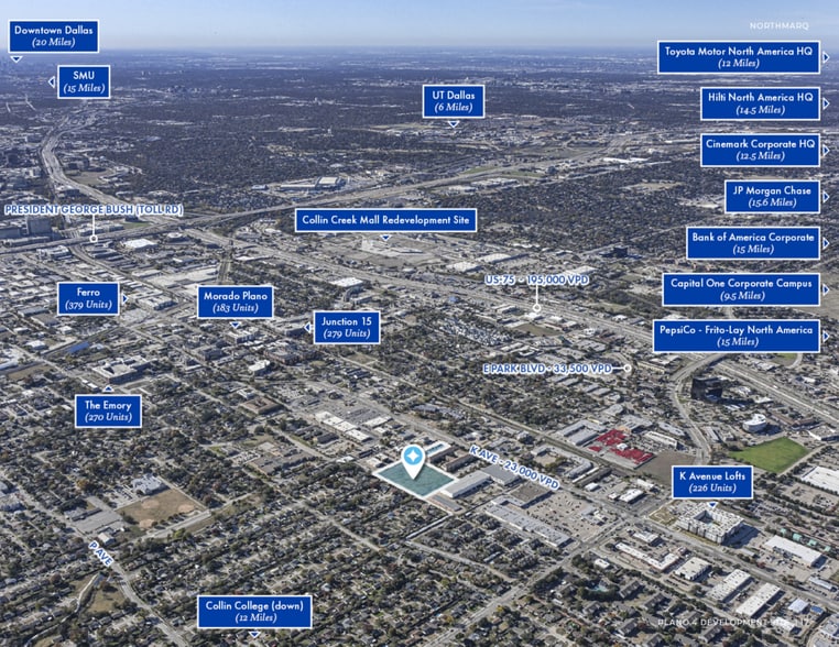 The property is strategically positioned just south of Park Boulevard, providing convenient access to major north–south and east–west thoroughfares, including US-75 (Central Expressway) and Park Boulevard. This prime location allows for efficient connectivity to Legacy West, Downtown Plano, and key employment centers throughout North Dallas, Frisco, and Richardson.
