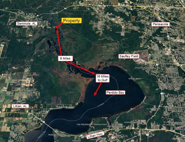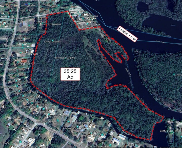 Approx. 35 acres with 3,000 + Ft of frontage on the Perdido River (east side) plus approx. 2,300 ft along a canal (west side). 6 miles to the mouth of Perdido Bay. 24 miles to the Gulf of America. A wetland study has not been done, but the seller believes that 10+ acres are probably wet (on the west side). Possible to divide into several lots with frontage on Perdido River.