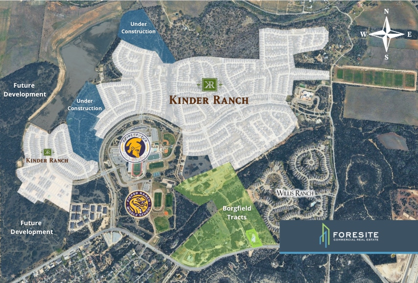 Prime Cstore / pad / professional office opportunity at Kinder Ranch - 1945 E Borgfeld Dr, San Antonio, TX 78260. This commercial pad spans across 2.39 acres and boasts a prime location at the gateway of Kinder Ranch. Lot is platted / water, sewer, and electric available (buyer to confirm all entitlements). Positioned at the entrance to the sought-after Kinder Ranch Master Planned Community, this lot offers incredible visibility and access.