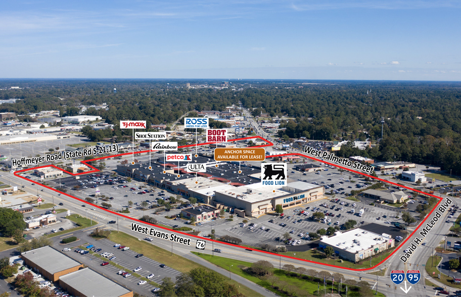 Florence Mall is a prominent shopping center in Florence, SC, situated at "Five Points," where West Palmetto Street intersects with State Road S 21-13 (Hoffmeyer Road) and State Road S 21-29 (S Cashua Drive). Located in the heart of the Pee Dee Region, Florence serves as a retail hub for surrounding communities. With over 329,000 square feet of prime retail space, Florence Mall is anchored by Food Lion and features a diverse mix of national specialty retailers, including Starbucks, Talbots, TJ Maxx, Ross Dress For Less, Ulta Beauty and Petco. The center spans an entire city block and is accessible from West Evans Street, S Cashua Drive, Hoffmeyer Road, and David McLeod Blvd Ext. No internet cafes.