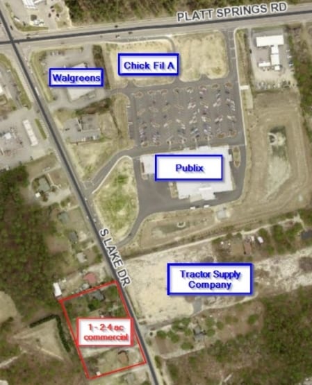 South of the Walgreens & Publix at the Intersection of South Lake Dr and Platt Springs Rd. Next to the Tractor Supply currently under construction. 5 acres zoned ID with 400 ft of frontage, located in high growth market of Lexington, SC, Significant Development within 1/2 mile: Walmart, Walgreens, Lowes Home Improvement, Food Lion, Aldi, McDonalds and White Knoll High School with 2,047 students.