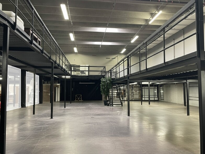- High ceilings, steel-framed mezzanine system, and polished concrete floors.