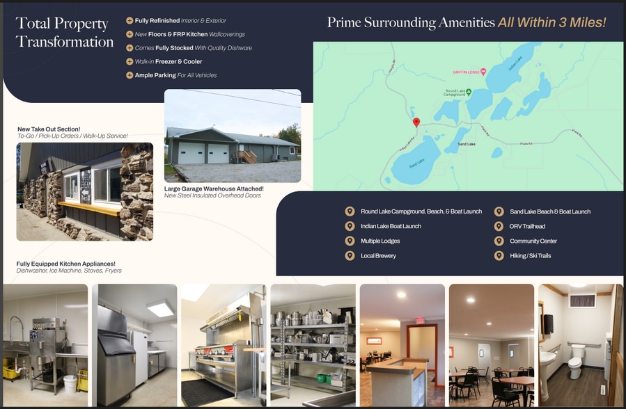 • Storage/Expansion: Includes a 1,300 sq ft warehouse with two 12' overhead doors (potential for conversion to a bar/patio area).