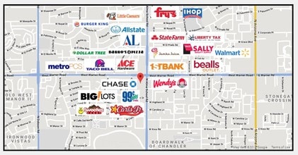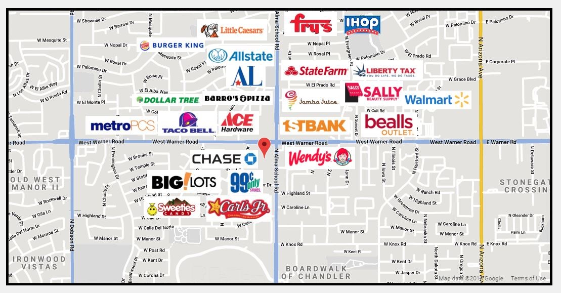 Warner Plaza is a 186,413 sq. ft. neighborhood shopping center that is located on the Southwest corner of Alma School and Warner Roads in Chandler, Arizona. One of the first Mediterranean Revival Style renovation properties dreamed up by Michael Pollack in 2015 to bring a unique aesthetically revamped shopping plaza that feels exotic and relaxing at an affordable price. Varying rooflines of the building highlight individual storefronts and entrances making the plaza resemble the feel of an outdoor market. Included in the renovation was the installation of extensive exterior stonework, new paint in a warm color scheme, updated landscaping and an improved parking lot. Renovations also included lighted windows strategically positioned on newly built towers, draped with romantic stripped canvas awnings and window flower boxes. One of the towers features includes a large clock, which contributes to the incredible architectural elegance. The crowning touch for the renovation to take the property over the top, gorgeous outdoor wall lantern sconces were mounted on large stoned columns placed in front of spaces providing extra lighting to help entice shoppers into businesses. Warner Plaza features a variety of storefronts with exceptional visibility and retail signage along both major arterial roads providing tenants with excellent exposure to passing traffic on a daily basis from the neighboring communities. The Plaza has an outstanding mix of national and locally owned businesses that include: Big Lots, 99 Cent Only Store, Sweeties Candies, American Furniture Galleries and enticing restaurants such as Bella Gusto Urban Pizzeria, Zorba’s Greek Café and Sozo Coffeehouse.