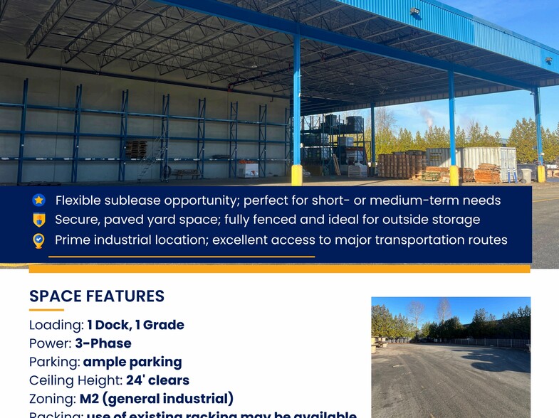 Available: Immediately. This sublease opportunity at 19645 92A Avenue in Langley, BC, offers a versatile industrial solution in the heart of Port Kells, one of Metro Vancouver’s most sought-after industrial hubs. The property features a secure, fully fenced yard of approximately 10,000 square feet, complemented by 6,000 square feet of covered storage and a 3,000-square-foot warehouse. With 24-foot clear ceiling height, 3-phase power, and existing racking potentially available, the space is well-suited for businesses requiring overflow storage, equipment staging, or distribution operations. The site provides excellent accessibility to major transportation routes, ensuring efficient connectivity to the Greater Vancouver area and beyond. Loading is facilitated by one dock and one grade-level door, while ample on-site parking supports operational convenience. Zoned M2 (general industrial), the property accommodates a wide range of industrial uses. Available immediately, the sublease runs through June 29, 2027, with the possibility of a longer term. This flexible arrangement is ideal for short- or medium-term requirements, offering a secure and functional base for industrial users.