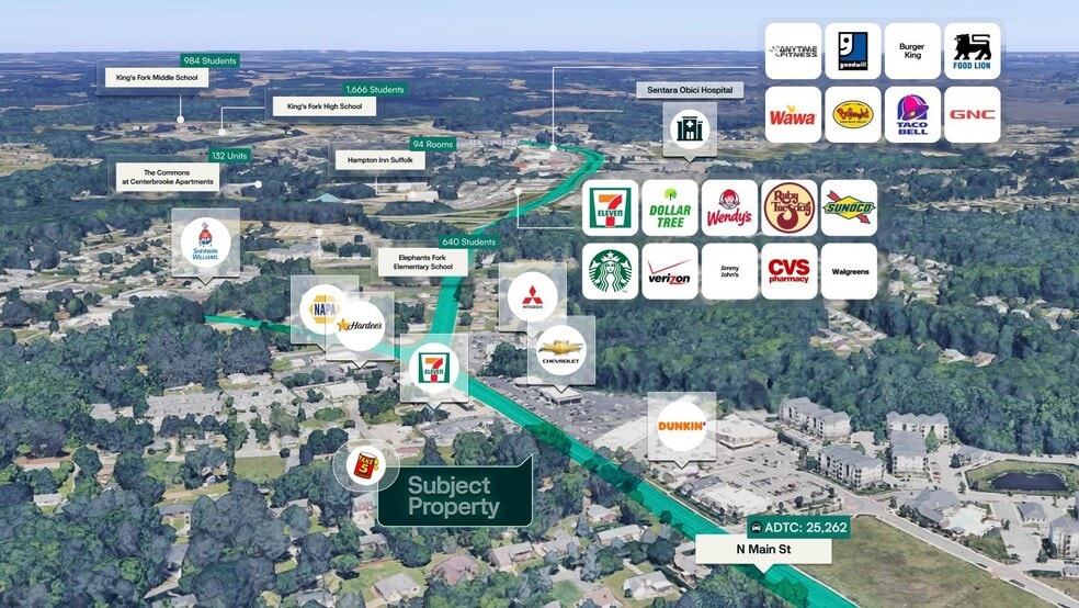 Surmount is pleased to present the exclusive listing for a Take 5 Oil Change located at 1975 North Main Street, Suffolk, VA 23434. The site consists of roughly 1,682 rentable square feet of building space on an estimated .73-acre parcel of land. Take 5 Oil Change is subject to a 20-year Triple Net (NNN) lease which will commence upon close of escrow. The annual rent will be $120,000 and has scheduled increases of 1.50% Annually.