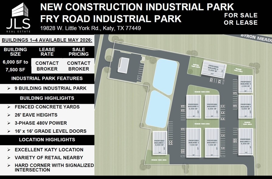 JLS Real Estate is pleased to offer the Fry Road Industrial Park, Building 2 for sale or lease. The Fry Road Industrial Park will include nine single-tenant buildings with fenced and concrete-paved outdoor storage yards, 26’ eave heights, and three-phase power. Build-to-suit office available. Buildings 1 through 4 are slated for delivery in May 2026.