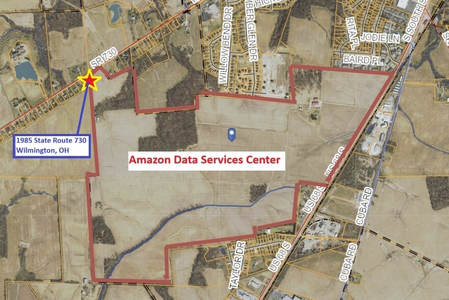 Investment Opportunity !! 1-Acre Property fronting State Route 730 and adjacent to new Amazon Data Services Center in Wilmington, OH. Includes a shared driveway to the Amazon property.