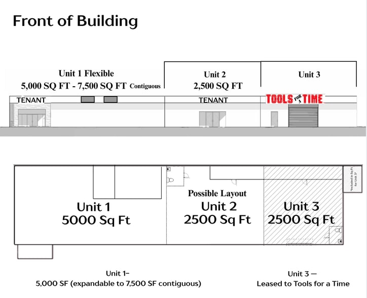 2,500 – 7,500 SF suites with drive-in/roll-up doors and grade-level loading Unit 1: 5,000 SF end-cap suite with prime Winfield Dunn Parkway frontage & maximum visibility (easily expandable to 7,500 SF contiguous with Unit 2) Best deal: 7,500 SF combo at blended $19.67 PSF $20.00 PSF (Unit 1) / $22.00 PSF (Unit 2 separate) base (Plus estimated NNN) – see pricing page for details Built 2001 -Ample parking (4 spaces per 1,000 SF) Prime tourist trade area: 500,000+ annual visitors near Pigeon Forge corridor and Downtown Sevierville on the Great Smoky Mountains Parkway Direct frontage on Hwy 66 / Winfield Dunn Parkway with easy I-40 access Retail neighbors: Target, Cavender’s Boot City, & Smoky Mountain Knife Works Ideal for retail, showroom, medical, fitness, office, or flex use Unit 3 leased to Tools for a Time — Units 1 & 2 ready for immediate occupancy!