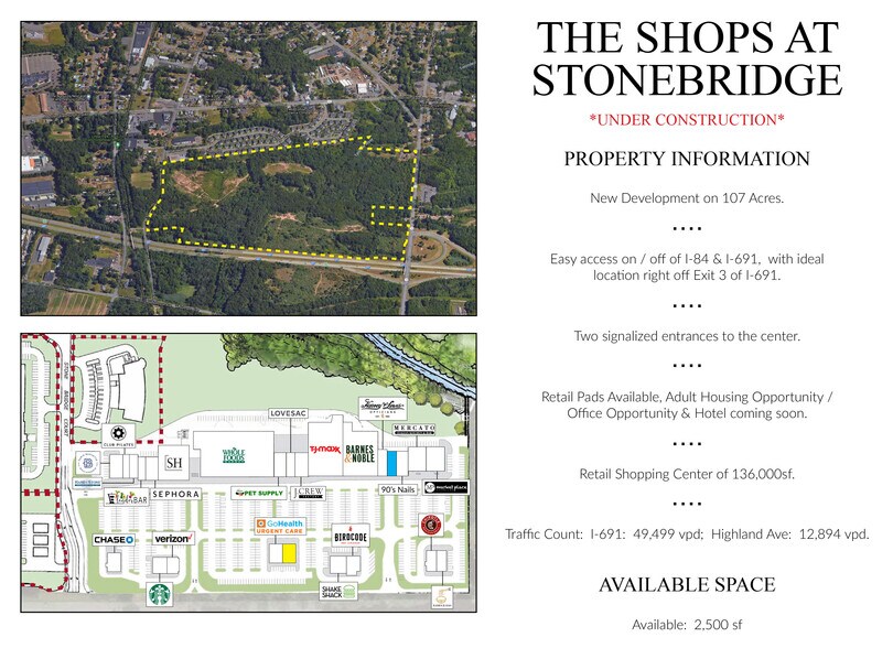 New Development on 107 Acres. Easy access on / off of I-84 & I-691, with ideal location right off Exit 3 of I-691. Two signalized entrances to the center. Retail Pads Available, Adult Housing Opportunity / Office Opportunity & Hotel coming soon. Retail Shopping Center of 136,000sf.