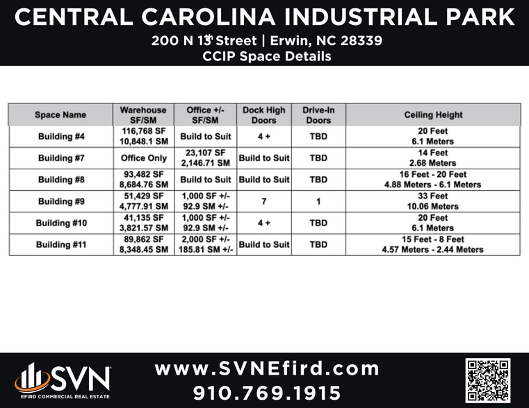 Central Carolina Industrial Park (CCIP) is located in Erwin, Harnett County NC, 2 turns and 5 miles from Interstate 95 off US Hwy 421 and 12 miles South of Interstate 40 & I-95 Intersection, 105 miles to NC Port Wilmington, The Park has multiple buildings accommodating various uses and sizes ranging from 41,000 to 600,000 square feet available. Ample parking and laydown areas across the property. All buildings are fully equipped with sprinkler systems. Reliable water and sewer services provided by Harnett County. Duke Energy substation is located on the property.
