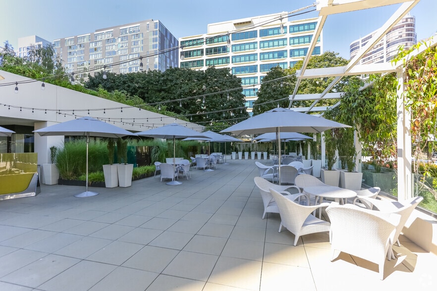 - Amenities include covered outdoor areas, a café, a fitness center, secure bike storage, lockers and showers, and valet service.