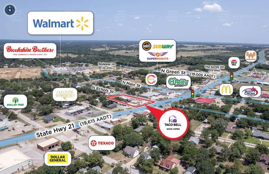 The property offers a prime retail location with high visibility and easy access along West State Highway 21, which experiences a high traffic count of 19,615 vehicles per day. In 2024, Taco Bell experienced strong growth, including a milestone $1 billion in profit and significant increases in both U.S. and international sales.