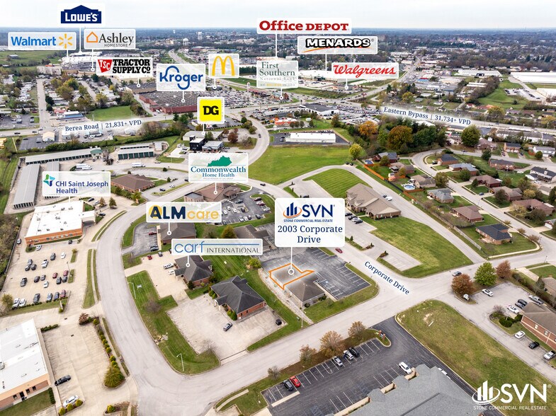 SVN Stone is proud to present for lease....a small office condo For Lease near high traffic retail, residential in Richmond. 2003 Corporate Drive, circa 2004 office condo building has a suite with 1700 sf of space for Medical, Financial, Therapy and more uses with large private office spaces, and open space as well. The zoning is B-3 and allows all types of uses here. The shared property adjoins Volunteers of America who leased the space in early 2025. Contact Senior Advisor, Neal Metcalfe, 859-312-8069, neal.metcalfe@svn.com to take a look at this office.