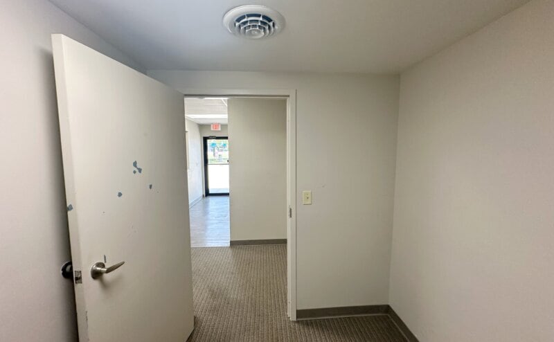 The available suite, 2001C Round Barn Road is an 860 SF suite within the easternmost building, and features three private offices, a reception area, an open work area, a storage closet, and a single restroom.