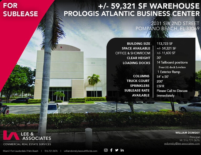 Lee & Associates presents the opportunity to sublease ±59,321 square feet of prime industrial space at 2031 SW 2nd Street in the prestigious Prologis Atlantic Business Center, Pompano Beach, FL. This high-functioning distribution facility offers 14 tailboard loading docks, four (4) dock levelers, and one (1) exterior concrete ramp for seamless operations. The warehouse features 30’ clear height ceilings, an ESFR sprinkler system, and 54’ x 50’ column spacing. The interior includes ±11,600 SF of newly constructed office and showroom space, highlighted by a 2,500 SF retail trade counter – ideal for companies seeking a customer-facing component. The site also features a generous 200' truck court and ample employee parking. Strategically positioned between Atlantic Boulevard and Powerline Road, this location ensures excellent connectivity to South Florida’s primary transportation arteries. Immediate access to I-95 and close proximity to Florida’s Turnpike allow for efficient regional and interstate distribution. Located within a 1.3 million square foot master-planned business park, the property benefits from a strong industrial ecosystem and proximity to Tri-Rail commuter stations and Fort Lauderdale–Hollywood International Airport, only 21 minutes away.